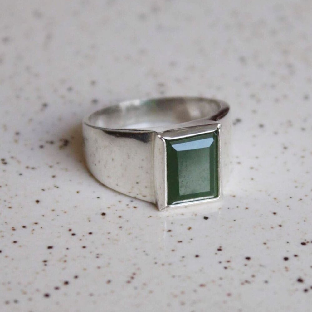 Vietnam Green Jade rectangular cut wide band silver ring
